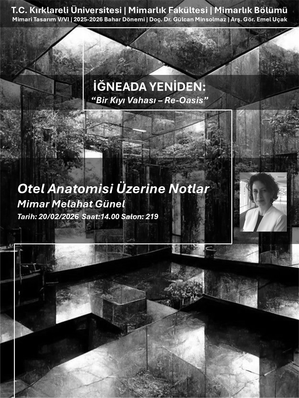 Mimari Tasarım VII kapsamında düzenlenecek olan seminer, 219 numaralı salonda, Mimar Melahat GÜNEL tarafından gerçekleştirilecektir.